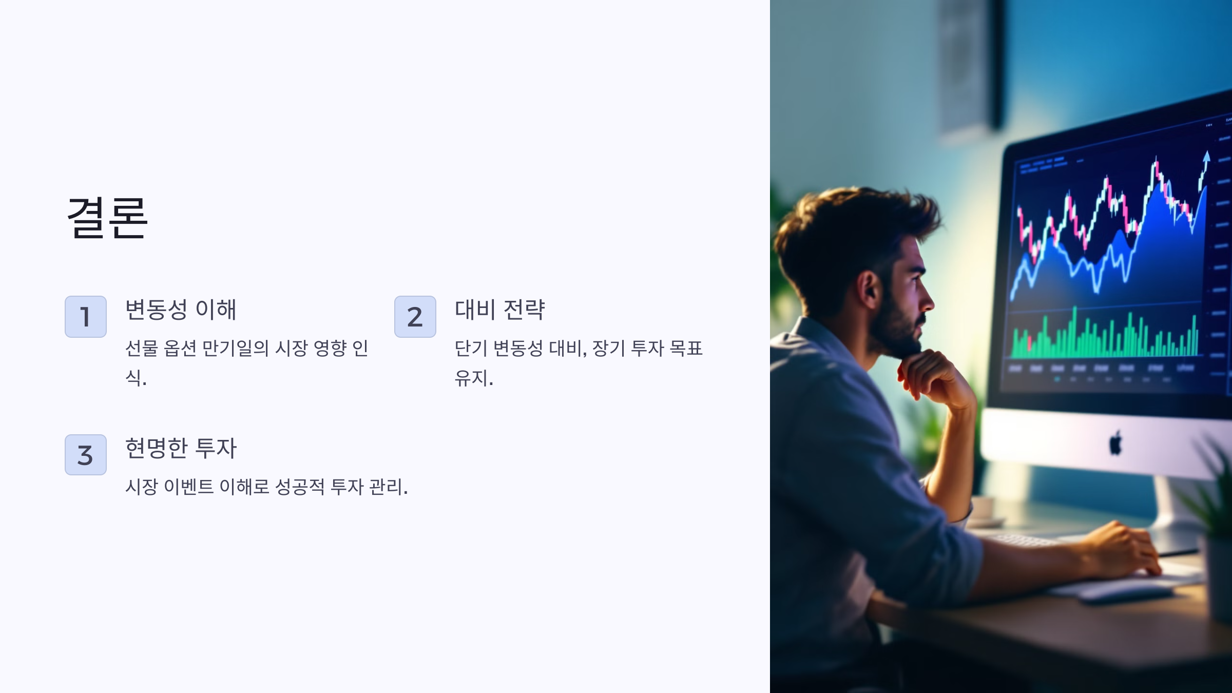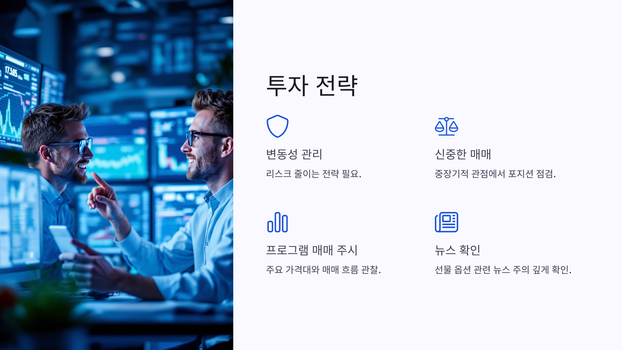 - 변동성이 높은 시기에는 평소보다 더 신중한 매매 전략이 필요합니다. 만기일 전후로 시장의 단기 움직임에 휘둘리지 않도록 중장기적인 관점에서 포지션을 점검하고, 장기적인 투자 목표에 맞는 전략을 유지하는 것이 중요합니다.
