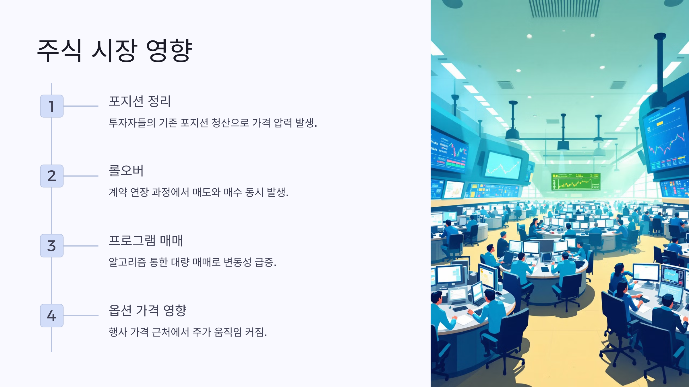 - 롤오버: 많은 투자자들이 만기일이 되기 전에 기존의 계약을 다음 기간으로 연장하는 ‘롤오버’ 전략을 사용합니다. 이 과정에서 기존 계약을 팔고 새로운 계약을 매수하게 되어, 일시적으로 매도와 매수가 동시에 발생하여 주식 시장의 변동성이 커질 수 있습니다.