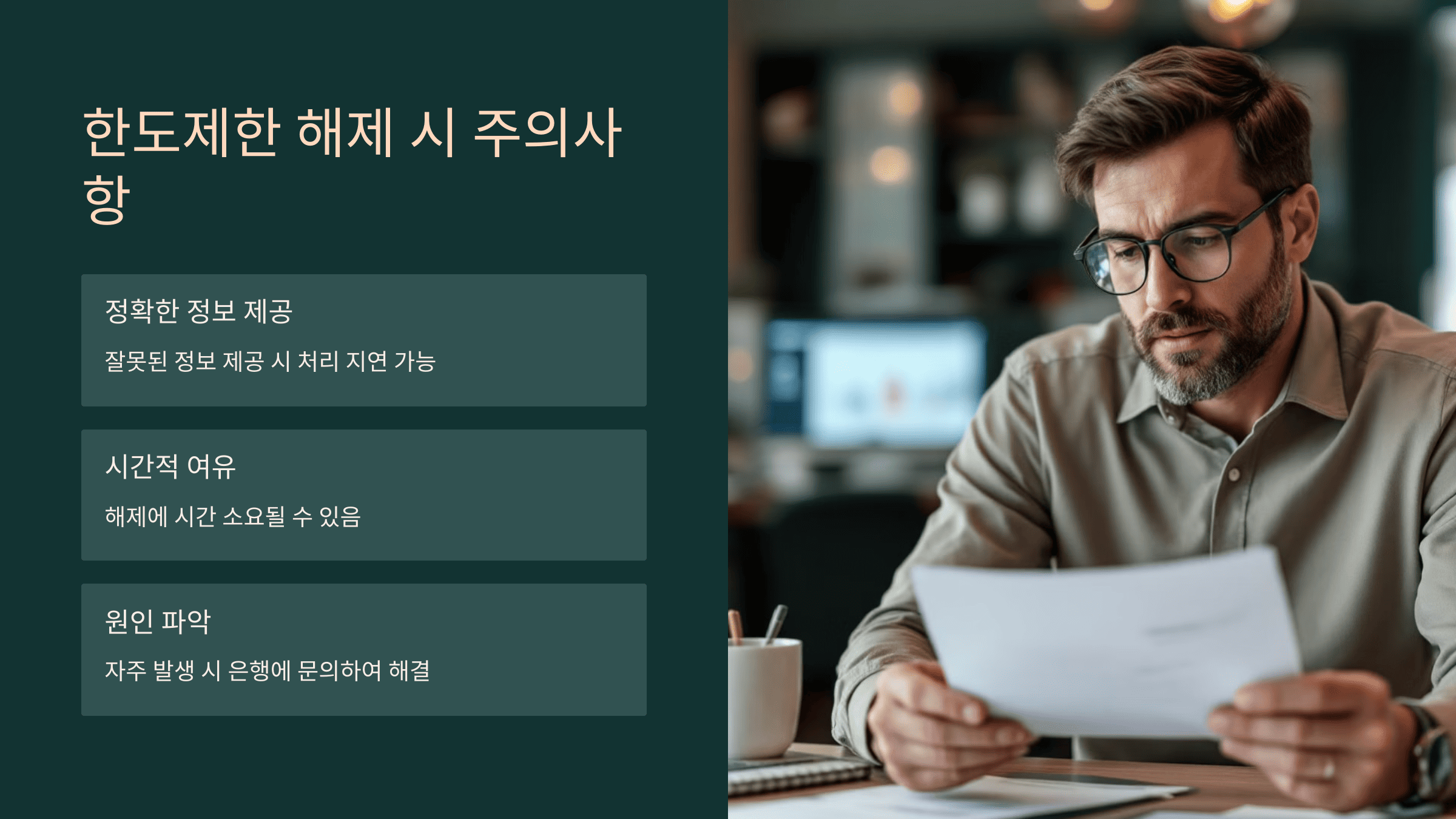 - 정확한 정보 제공: 한도제한 해제 신청 시 정확한 정보를 제공해야 합니다. 잘못된 정보를 제공할 경우 처리가 지연될 수 있습니다.