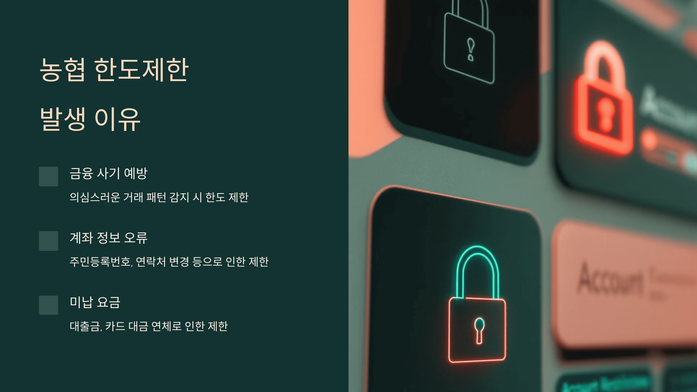 농협 계좌 한도제한이 발생하는 이유는 다양합니다. 대표적인 원인으로는 다음과 같은 것들이 있습니다.