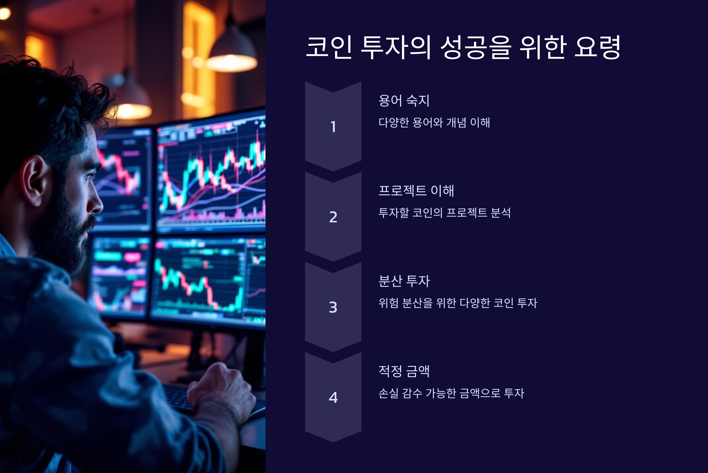 코인 투자는 높은 수익을 기대할 수 있지만 그만큼 위험성도 큽니다. 따라서 다양한 용어와 개념을 충분히 숙지하고, 투자할 코인의 프로젝트를 잘 이해한 후에 결정을 내리는 것이 중요합니다. 특히 변동성이 크기 때문에 분산 투자와 손실을 감수할 수 있는 금액으로 투자하는 것을 권장합니다.
